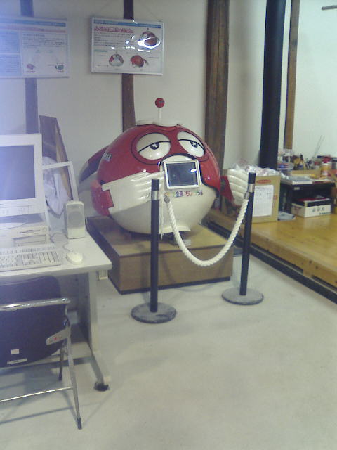 | どーん!・・・はい微妙。 その名もハイテク金魚ちょうちん 「しらかべ金蔵くん」! ITを活用した超遠隔操作が可能で自由自在に動き回ることもできるそうなんですが・・・ 隅っこに追いやられています。活躍させてあげてほしい。 そんなこんなで、口のDVDモニターは何に使うんだろうっと思っていると、岩田がこの体験工房で見つけたパンフレットをくわえてやってきてこういうのです。「お前の探している古墳は金の古墳か銀の古墳か?」っと。「金のこふーん!」 |