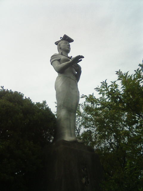 | この昆布婦人の巨大モニュメントが! 自由の女神みたいにこの地区を暖かく見守っています。こりゃここで正解だな!っと2人はワクワクモードで古墳見学にGO! ところが・・・古墳は微妙・・・・ 微妙すぎて写真撮る気力もありませんでした。 どうやらここは古代の女王の骨が出た古墳としては有名らしいけど、古墳はでかくないらしい。 インターネットで見つけた古墳はこれじゃなーい!!と憤慨。まぁとりあえず柳井市内にいくかぁとあきらめたのでした。 |
