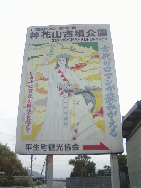 | 地図に神花山古墳公園というのを発見!インターネットで調べてたんだけど行きたい古墳の名前を忘れてしまっていたので「とりあえずここじゃな〜い」と行ってみる。 っと、スゲー看板が目の前に!! 「古代のロマンが蘇みがえる」 「いま千六百年の時空を超えて」 心揺さぶるキャッチフレーズにメロメロです。さらに手前の人の髪型がスゲー。ありえない。頭の上に昆布が乗ってるみたいな髪型です。 さらーに! | ||||||||||||||||||||||||||