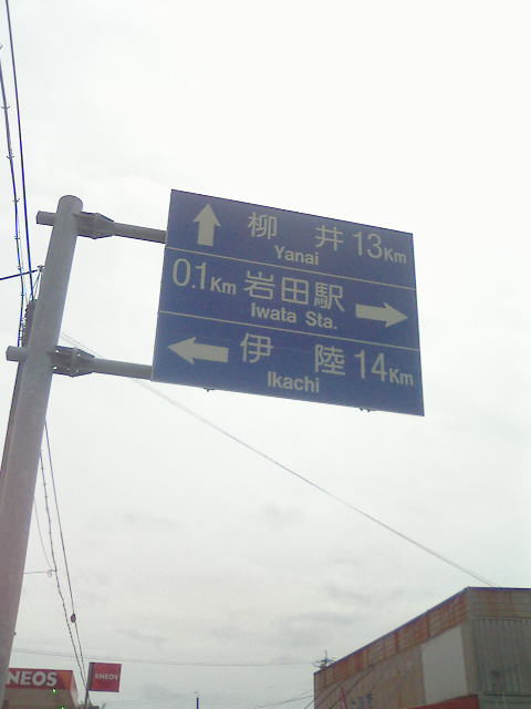| 高速を降りて柳井に向かう途中、なにやら違和感のある道路標識に遭遇! 「岩田駅」!! これを見過ごす僕たちではありません。進路変更、岩田駅へと向かうことに・・・ | ||||||||||||||||||||||||||