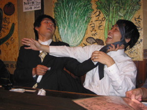| 前の日に勢いつけるために酒飲んだのが失敗で、あんまり準備してないから本当は大ピンチのはずなのに妙に堂々としたメンズ2人。 前日の夜中の練習は異常やったねぇ。気が付けば台本も大幅にカットやし。最後は4割ぐらいはアドリブやった気がする。 |