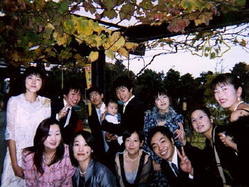 | 外でみんなで記念撮影。ナカツカさんのベイビーにはじめてあったよ。かわいかったぁ。今回私なぜかオールしちさんヘアーでございました。 女性陣はまれに見る気合いの入れ用でありまして・・ |