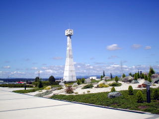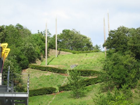 んで、じゃーん。これが日本のへそ。 えっドコ?って一瞬思うけどこの4つの棒の真ん中辺りがへそらしい。 たしか外国人のデザイナーがつくったんだったような。でもなんか適当だな〜日本のへそ。どうせならデベソの置物とかあるといいのに。 |
