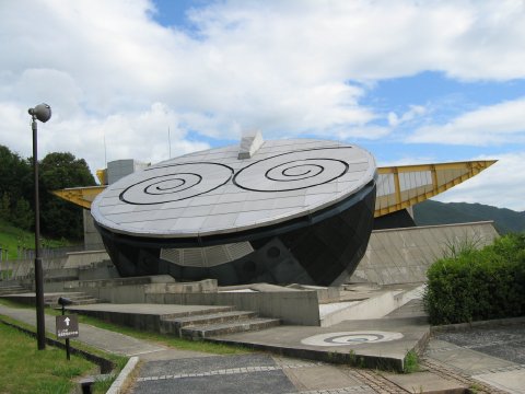 入ってまず目に入るのはこれ!経緯度地球科学館「テラ・ドーム」 。かよちゃんの喜びそうな名前の建物。だけどどうしようもないぐらい微妙なデザイン。宇宙がテーマみたいだけどもしかしてウルトラマンイメージしちゃった?コレ?これもふるさと創世でつくっちゃったモノらしいです。