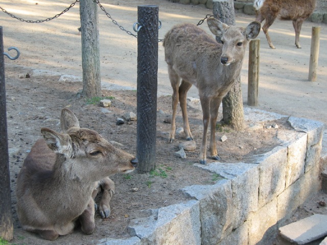 鹿。 広島でも思ったけどすげ〜人になれる動物だよね。 野性の鹿とかからは想像できないほどくつろいでるし。とてもシシガミ様の子孫とは思えない・・。 |