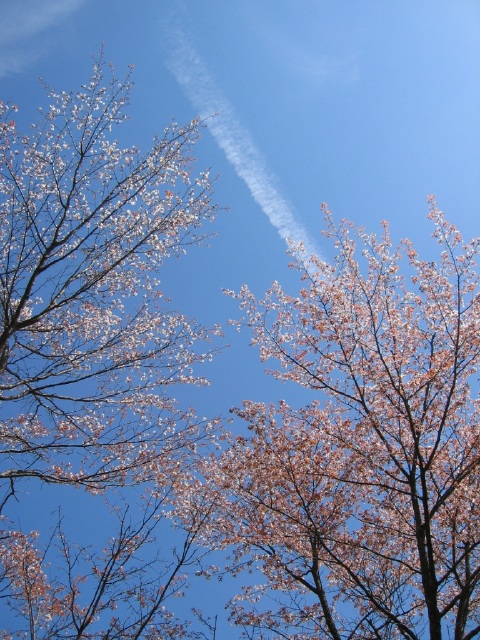 空を見上げると真っ青な空に桜と飛行機雲。 がんばってきてよかったって瞬間です! |
