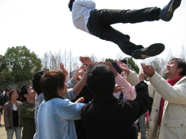 | 卒業のお祝いにトミーをみんなで投げて遊ぶ。思ったよりずっと軽いトミー。飛び過ぎてビビった。そんなトミーも実は卒業生。おめでとね〜! |