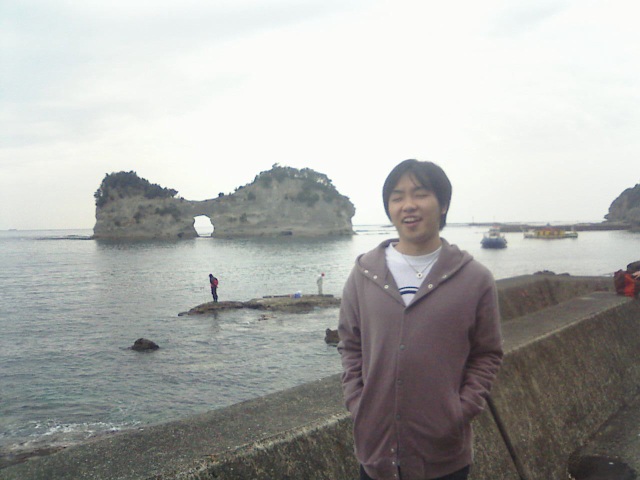 はい、カメラを向けるとこんな顔しちゃうシャイな俺を付け合わせに円月島。 波の力で真ん中に丸っこい穴があいてます。 | |||||||||||||||||||||||||