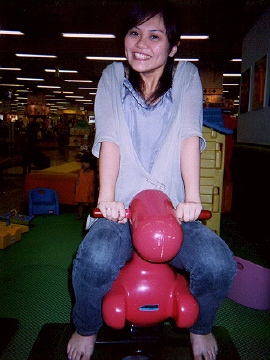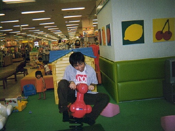 ユメタウンで時間をつぶし休憩がてらベンチに座ってると隣に児童用のプレイランドが・・ 思わず名誉児童の僕はお馬さんにライド! うしろのレディーも見とれてる? |